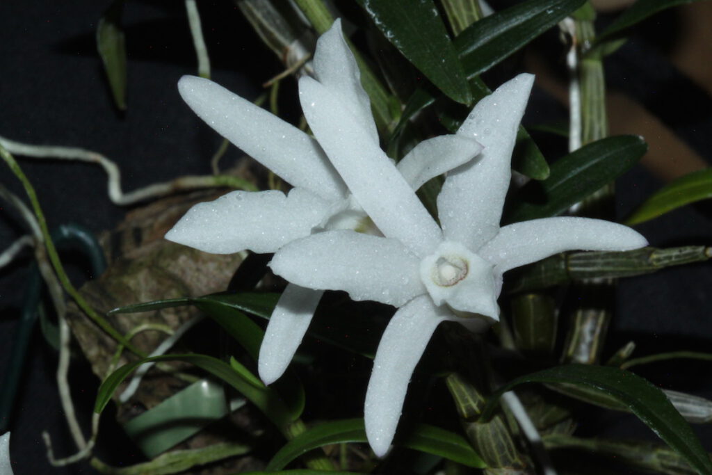 Bei meiner leider einzigen Reise zur größten Orchideenschau der Welt, dem Tokyo Dome, war ich fasziniert von den vielen dort ausgestellten Dendrobium moniliforme Pflanzen. Viele davon waren gar nicht in Blüte sondern wurden nur wegen ihrer Wuchsform oder ihren grün-weißen Blättern gezeigt. Es gab sogar Wettbewerbe mit dieser Art, die sich um den jeweiligen offenbar unterschiedlichen Duft drehten. Von damals sind mit der Zeit einige Pflanzen in meiner Sammlung gelandet. Eine davon, aufgebunden auf Korkeiche blüht gerade. Die Pflanzen sind jedenfalls bei mir anfällig für Spinnmilben. Die durch das Fehlen wirksamer Spritzmittel eher schwer zu bekämpfen sind. Trotzdem schaffen es die Pflanzen immer wieder auszutreiben und wie eben jetzt sogar zu blühen. Mit Düngung sollte man etwas vorsichtig sein. Am Besten nur mit der Hälfte der empfohlenen Konzentration.